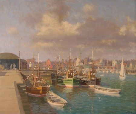 | South Pier, Bridlington, with fishing boats and fishermen, looking towards Clough Hole | |