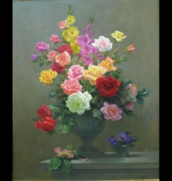 | still life study of an urn shaped vase of flowers on a table, a posy bowl beside it | |
