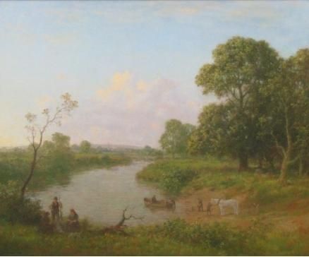 | The Ferry Boat, river landscape scene with figures in a boat and on the bank, a horse by the water | |