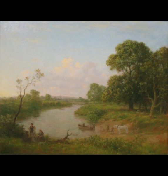 | The Ferry Boat, river landscape scene with figures in a boat and on the bank, a horse by the water | |