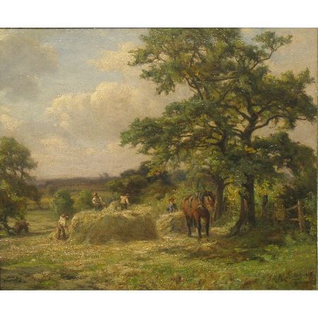 | harvesting scene with figures and a horse in a field beneath a tree | |