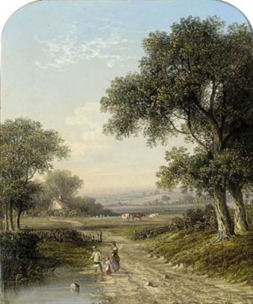 | A boy with a basket on a wooded track and a girl picking berries, an extensive landscape beyond; and A family on a wooded track | |