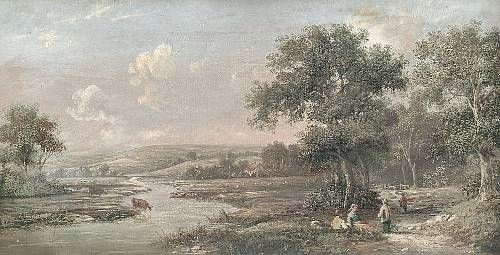 Figures by a river with cattle watering