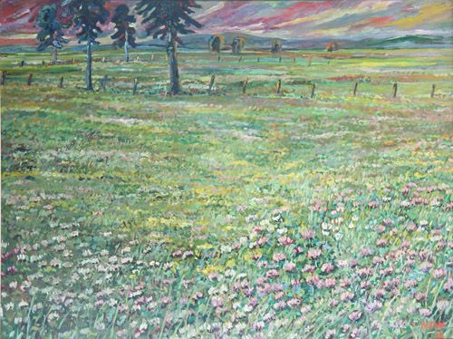 Wiese mit blühendem Klee, im Hintergrund Blick in weite Landschaft
