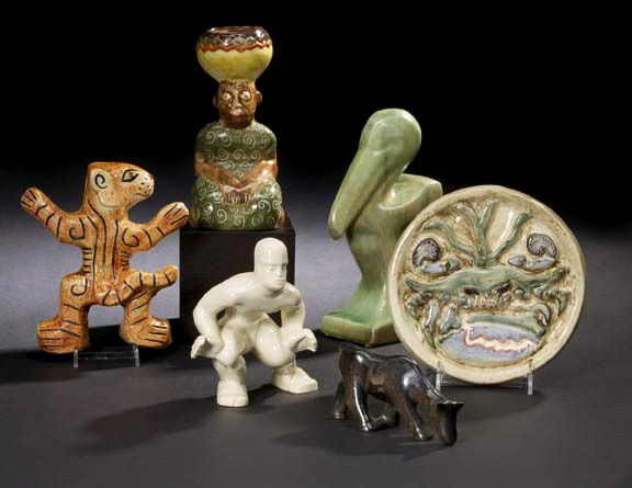 | for the Shearwater Pottery, Ocean Springs, Mississippi, large "Pelican" bookend in "Antique Green" glaze, ca. 1940 | |