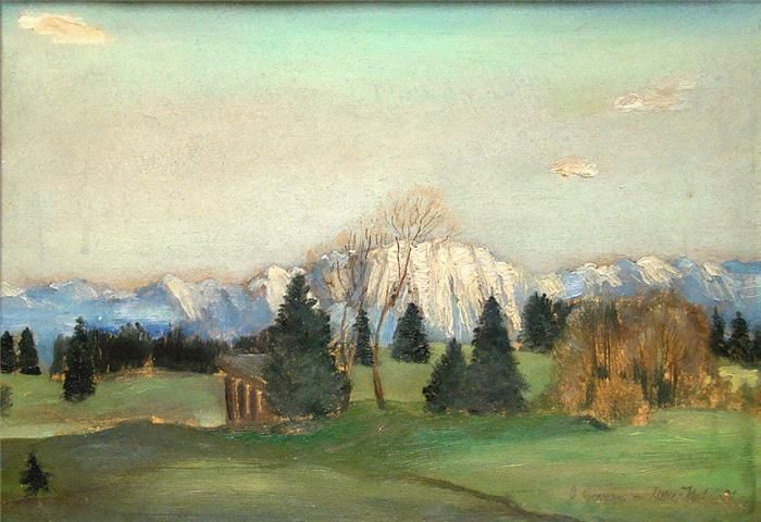 Voralpenlandschaft, im Hintergrund verschneites Felsmassiv