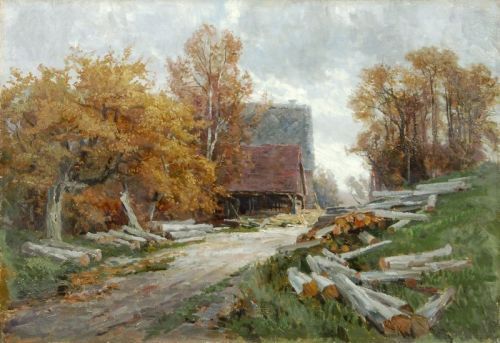 Herbstlandschaft mit altem Sägewerk. Um 1920