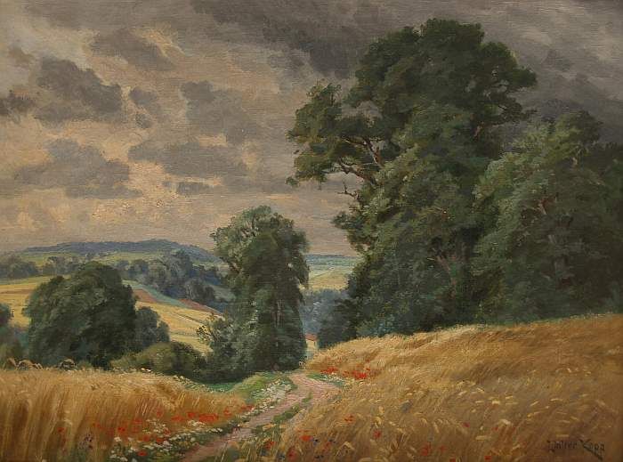Sommerliche Landschaft mit Getreidefeld und blühender Wiese