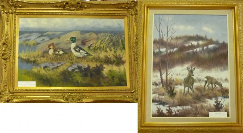 Fågelpar vid strand resp rådjursbock och rådjursget i vinterlandskap