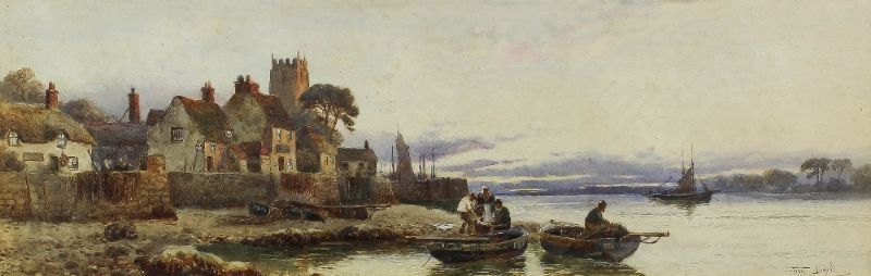 | Village harbour scene with figures unloading two fishing boats and with cottages and church to bank | |