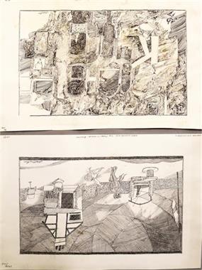 | Fünf Federzeichnungen: "Schuh auf dem Kopf...", "Holzmaske...", "Mein täglicher Spaziergang", "Frei Volksbühne..." und "Kaiser.. | |