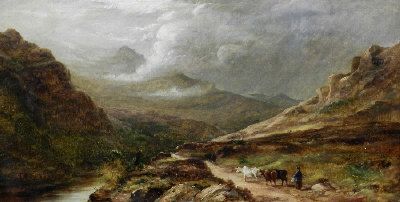 A figure with cattle on a Highland path