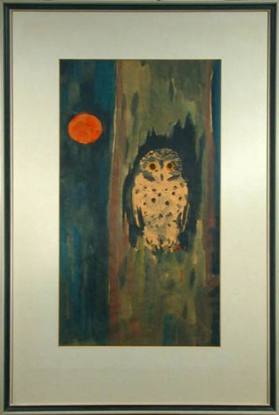 Nachtstimmung mit rotem Mond, auf der rechten Bildseite ein Käuzchen in einer Baumhöhle
