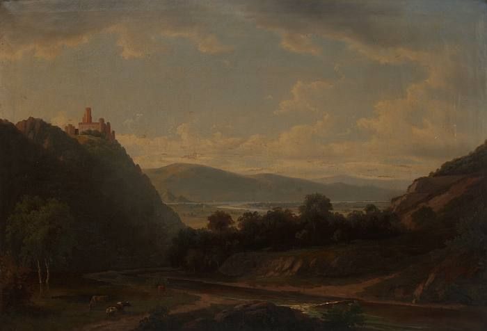 Weite stimmungsvolle Flußlandschaft mit hochgelegener Burg