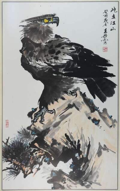 Eagle perched on a rocky outcrop, with calligraphy and red seal mark