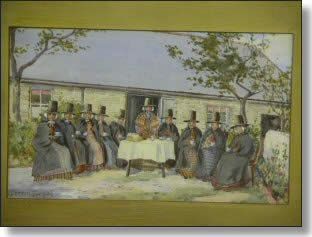 a group of Welsh women in traditional costume taking tea outside a meeting house