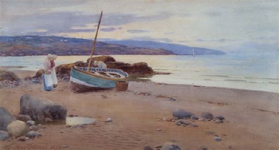 coastal view with figures and beached fishing boat