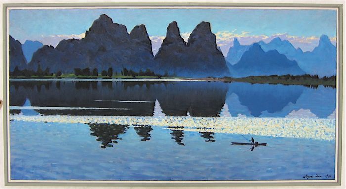 | Twilight, a panoramic landscape with lake in the foreground and man in a boat | |