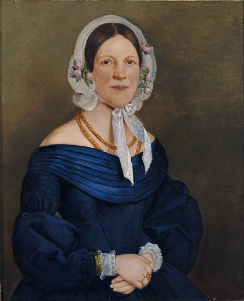 Portrait einer jungen Frau im blauen Kleid mit goldener Kette und Spitzenhaube