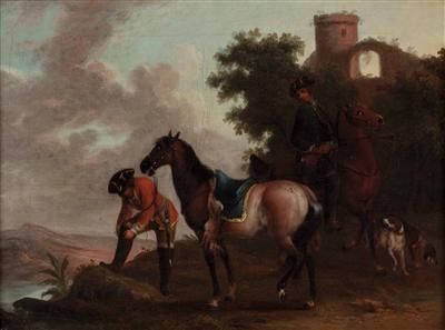 Zwei jagende Reiter mit Hunden vor Burgruine