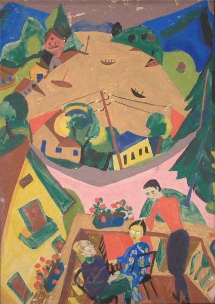 Expressive Darstellung des Tegernsees mit Personen auf Balkon