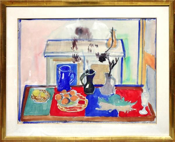 Stillleben mit Obst und Kannen, auf einem Tisch arrangiert