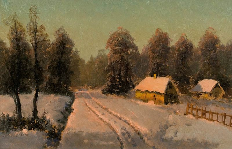 CHATY POD LASEM W PEJZAŻU ZIMOWYM