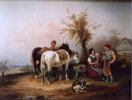 | Bäuerliches Anwesen mit davor Personen in Unterhaltung, sowie Pferde und Hund | |