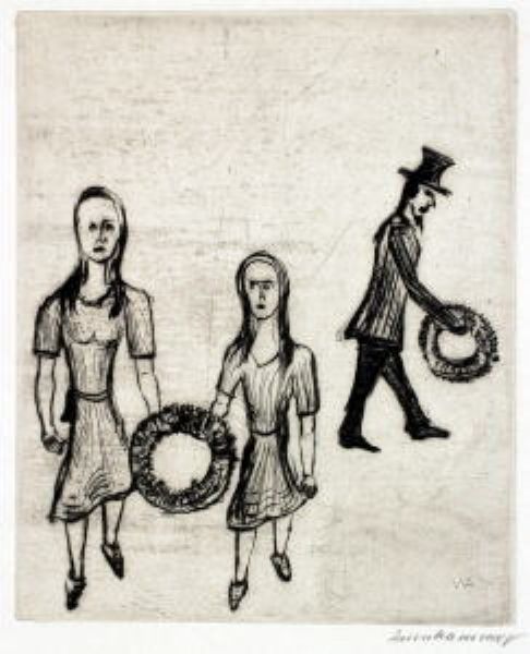 Drei Personen mit Trauerkränzen