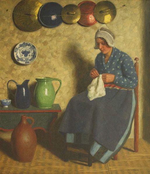 Holländische Küchen-Interieurszene mit sitzender Frau beim Sticken
