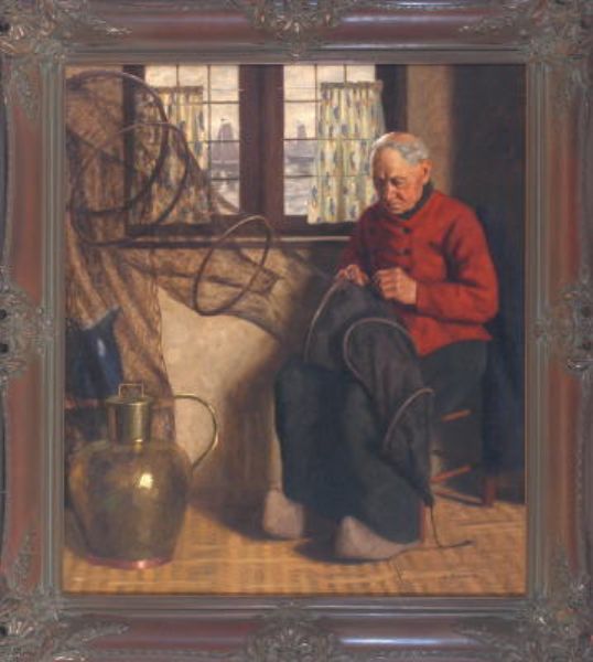 Netzflicker in der Stube am Fenster mit Blick aufs Meer mit Segelschiffen
