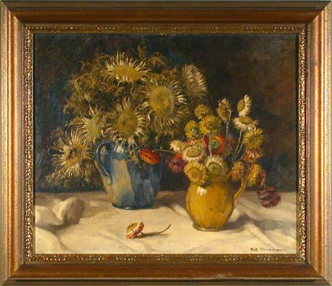| Zwei Schwarzwälder Tonkrüge, gefüllt mit getrockneten Blumen und Silberdisteln | |