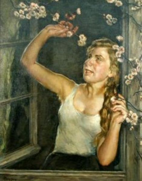 Karlsruhe Junge Frau am Fenster mit Kirschblütenzweig