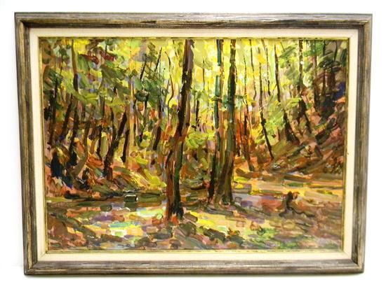 | depicts an impressionist style landscape scene of a sunlit forest valley | |
