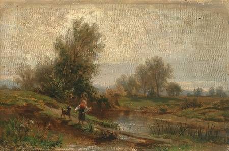 Bachlandschaft an einem Sommertag, Kind mit Ziege am Ufer