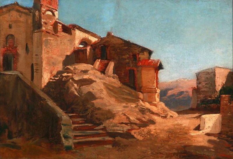 Landskab fra Olevano, med en kirke