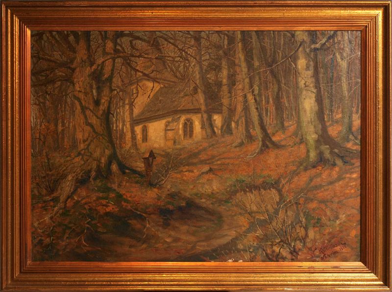 Kapelle im herbstlichen Laubwald. Im Vordergrund ein Marterl an einem Weg