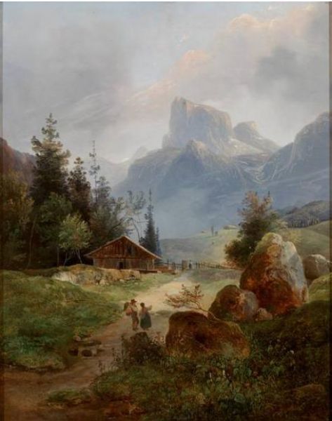 | Prachtvolle Gebirgslandschaft mit aufragendem Massiv, im Vordergrund Alm mit Figurenstaffage. | |