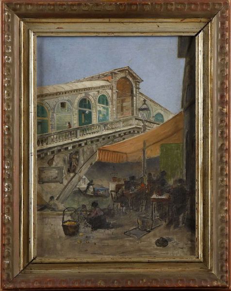 Utsikt mot Rialtobron i Venedig, intyg a tergo