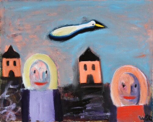 Composition with figures, houses and a bird