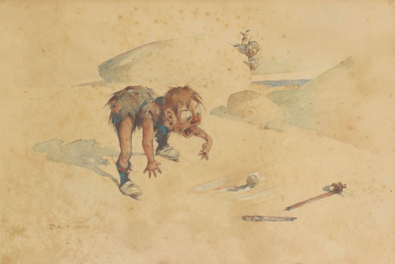 | Unusual illustration depicting two insect like caddies peering over a rock at their distraught golfer boss who is standing over | |