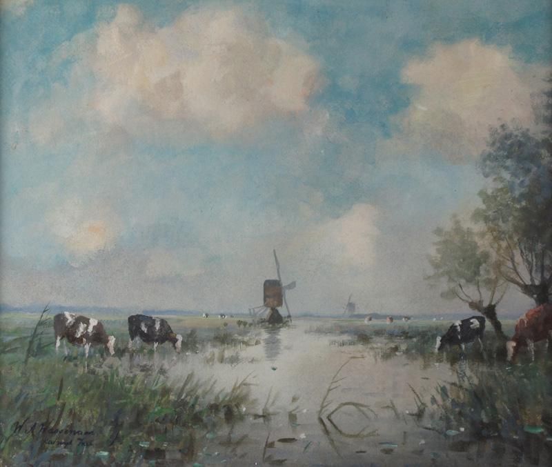 | PASTORAL SCENE WITH CATTLE WATERING AND WINDMILL | |