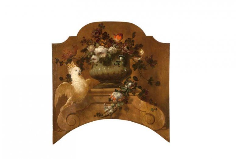 Een Bovendeurstuk met witte kakatoe op marmeren basement onder rijk gevulde bloemvaas.