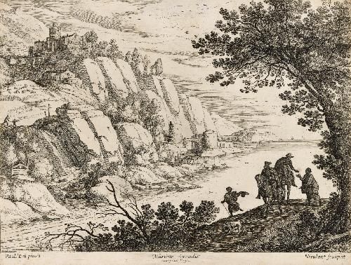 Dorf am felsigen Gestade mit almosengebenden Reitern