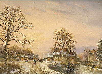 | In stimmungsvollem Licht idyllisch verschneite Dorfstraße mit gefrorenem Weiher | |