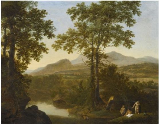 | Italian landscape with tall trees and bathing nymphs in the river. | |