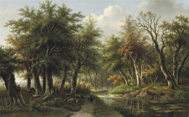 Figures on a forest-path along a stream
