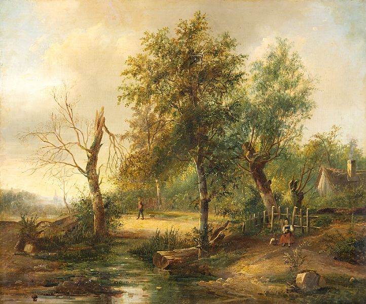 Landschaft mit Bauernhaus am Flussufer unter Bäumen. Am Weg strickendes Mädchen
