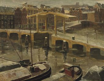 | Magere brug in sneeuw: Moored boats in winter, Amsterdam | |