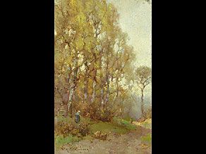 | REISIGSAMMLERIN AM RAND EINES BIRKENWALDES MIT NACH HINTEN VERLAUFENDEM WEG | |